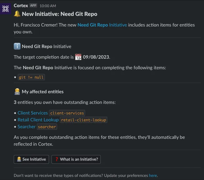 Cortex will also ping engineers on Slack when the Initiative is first created and when the Initiative deadline is coming up. Now nobody has to be the bad guy.
