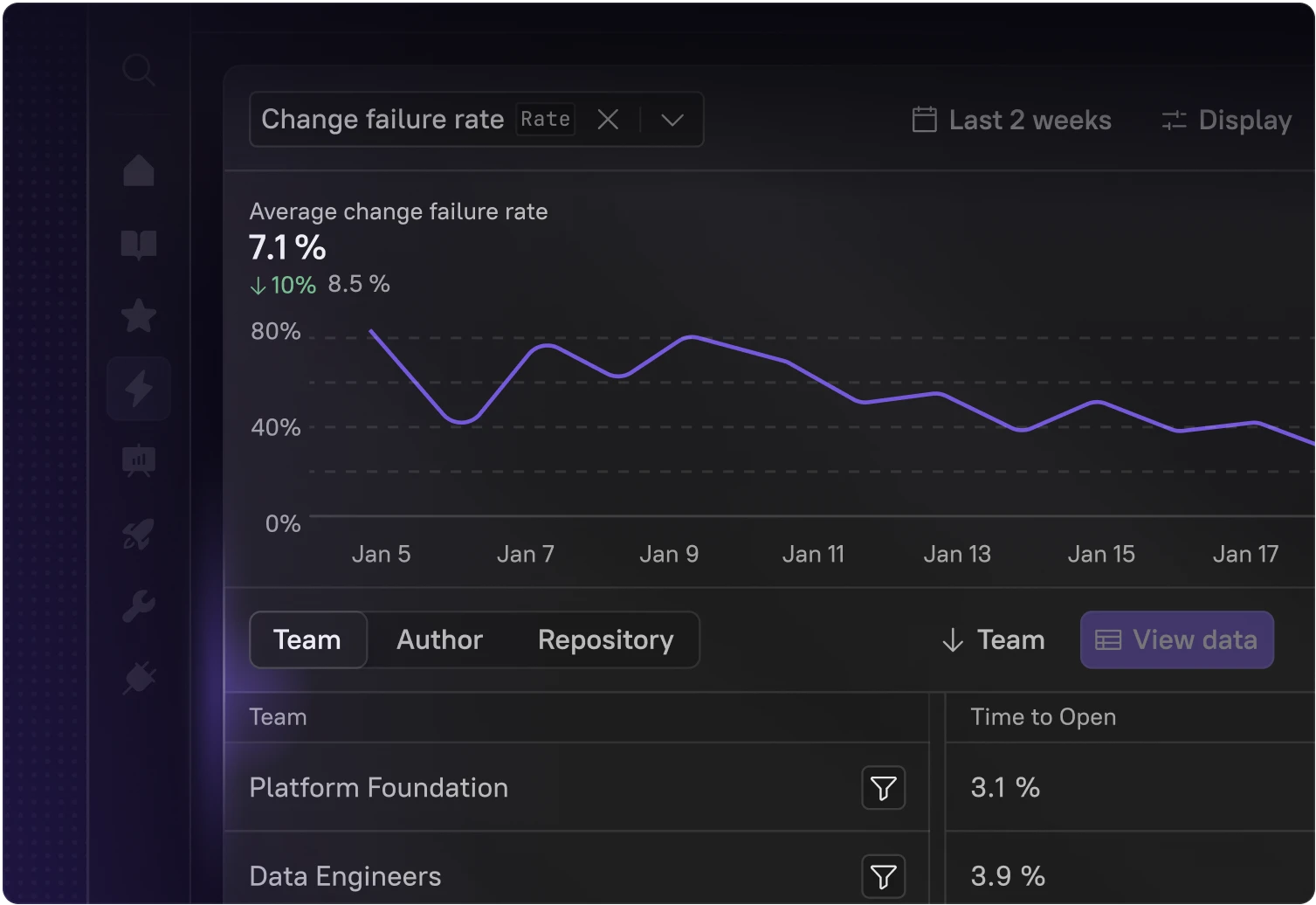 Bring in data from your existing tools – Git, incident management, project management platforms – and automatically surface insights into velocity, incidents, DORA metrics, and more.