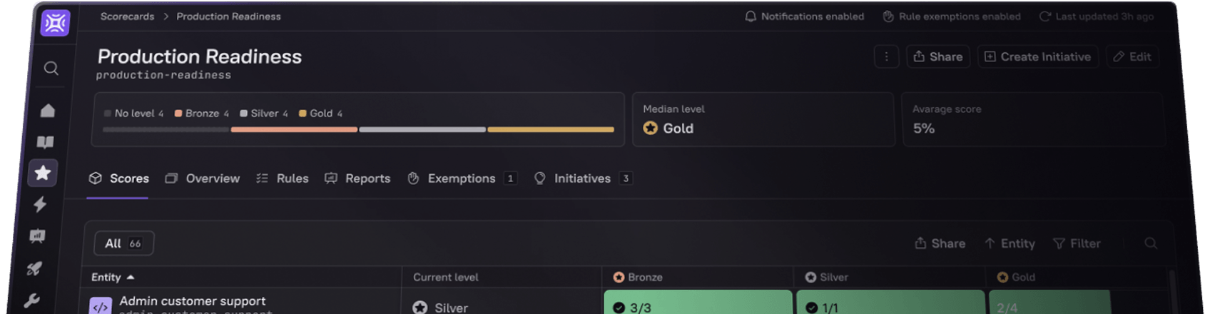 Build any Scorecard in minutes – from production readiness to security compliance to AI maturity. With data pulled automatically from your existing tools, it’s easy to define standards, track progress, and drive improvement across teams.