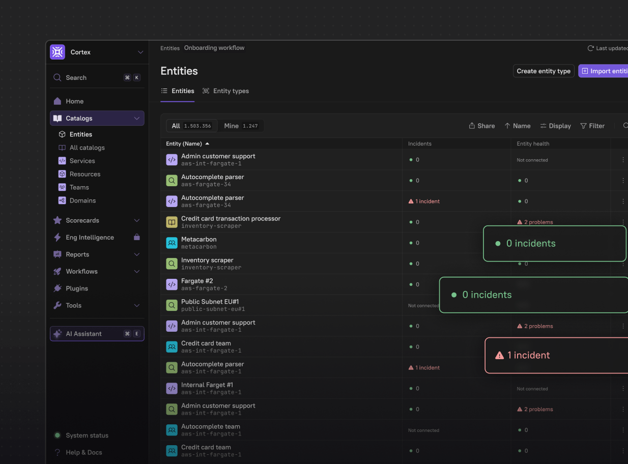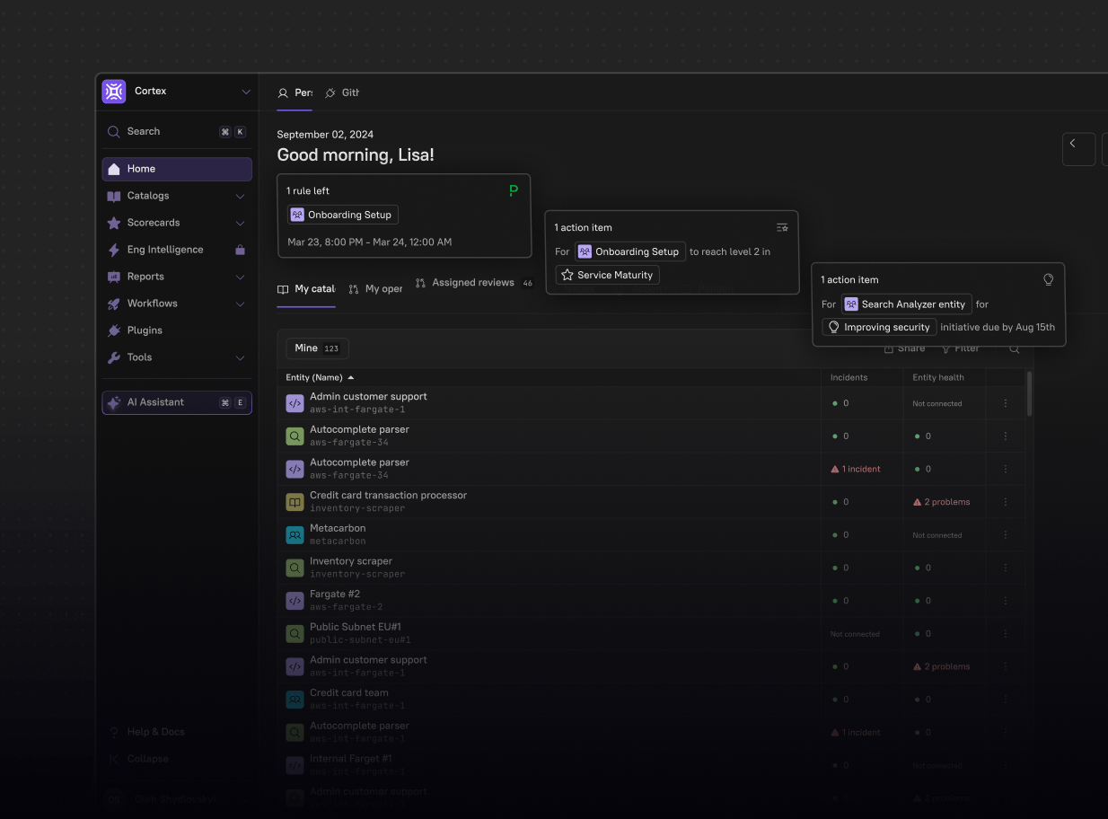Cortex strengthens your security and compliance posture by embedding standards across the development lifecycle. With automated checks, customizable scorecards, and consistent enforcement, Cortex helps teams maintain compliance without adding complexity, reducing risk across all stages of software delivery