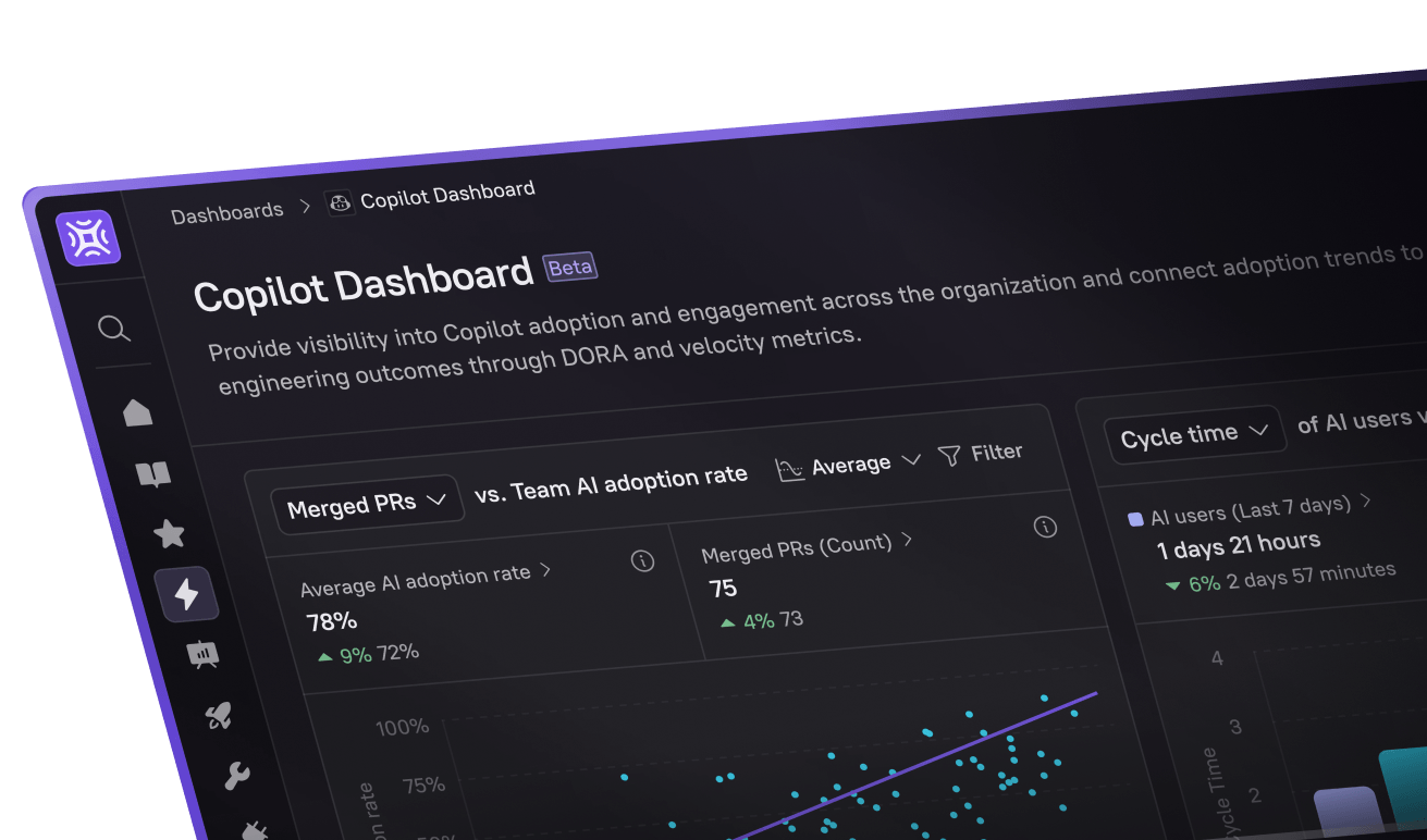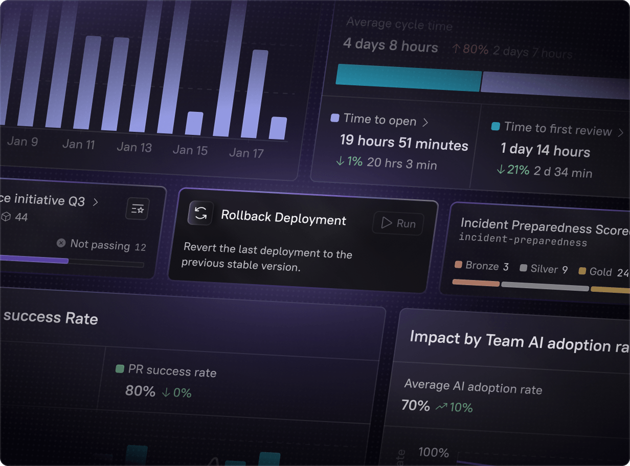 Get complete visibility into every engineering initiative. From reliability to security to AI adoption, drive measurable improvements that connect directly to business outcomes.